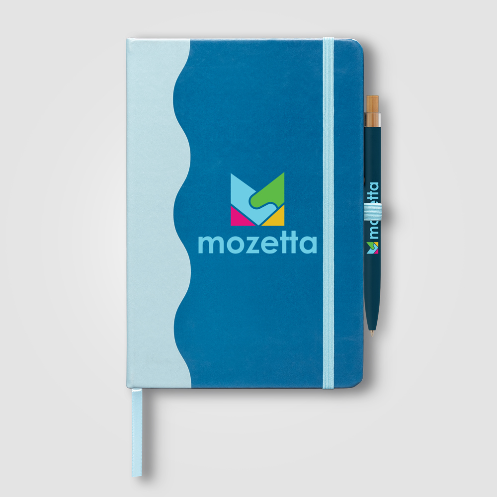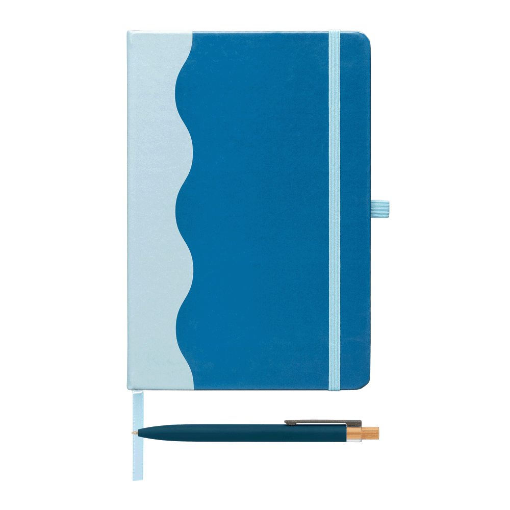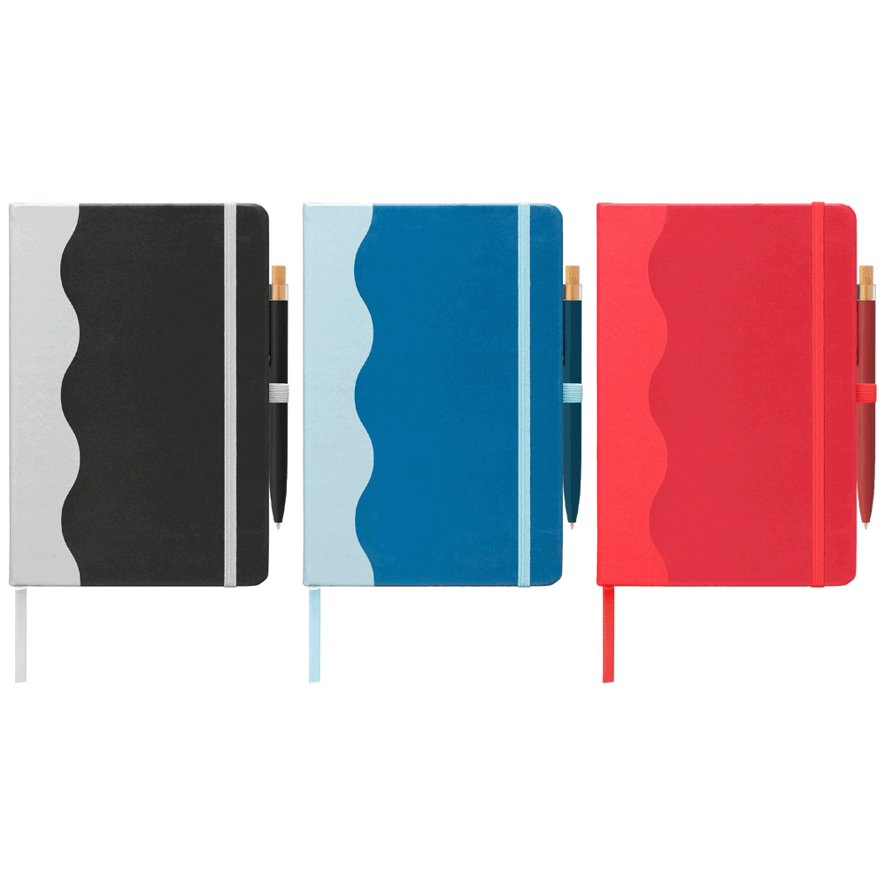 **Coming soon – Late March** The Grete Journal & Pen Set is a complete, upscale package for sophisticated note-taking. The cover is made from PU (polyurethane) with 33% post-consumer recycled content, featuring a sleek and eye-catching printed wave pattern accent that runs across the spine and covers. The premium design continues inside with a matching two-tone wave pattern printed on the interior covers. For convenience, the journal is case-bound and includes a colour-matching elastic strap closure, an integrated elastic pen loop, and a satin ribbon bookmark. Paired with a matching MTR pen, the set includes 80 sheets of 70 gsm FSC®-certified lined paper, ensuring the Grete journal set is a stylish and ready-to-use executive accessory.