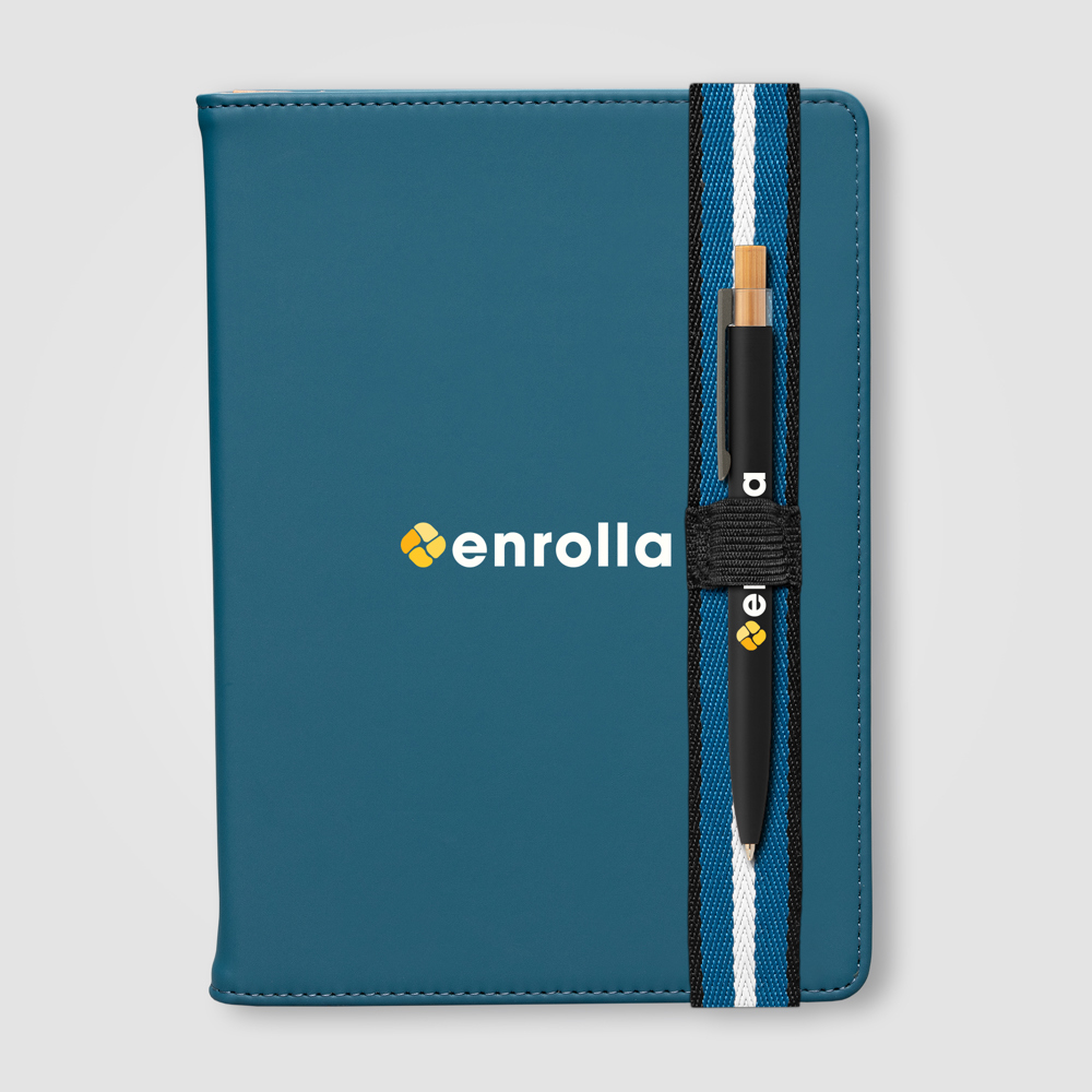 **Coming soon – Late March** This Newport Refillable Journal & Pen Set is a complete, sophisticated package for taking notes. The journal cover is made from PU (polyurethane) that contains a minimum of 50% post-consumer recycled content, complemented by a luxurious interior lining. Its distinctive look comes from the chevron weave strip sewn onto the elastic closure, which also keeps the journal securely closed. Functionality is maximised with a refillable inner structure, an inner document pocket, and a pen loop conveniently placed in the centre. The set is complete with a black MTR pen and includes an A5 notebook with 80 sheets of 70 gsm FSC®-certified lined paper, ensuring you have everything you need in one stylish, conscious collection.