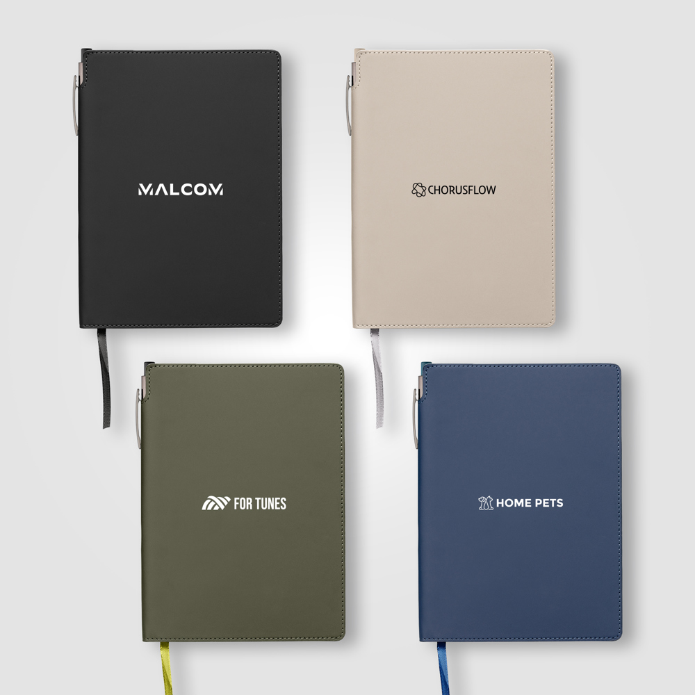 **Coming soon – Early March** Embrace the timelessness of the Malmö Recycled Journal, a sophisticated and seamless addition to the collection. This A5 journal features a soft, case-bound cover crafted from durable PU (polyurethane) containing 58% recycled content (40% post-consumer and 18% pre-consumer). Designed with practicality in mind, the extended spine includes a cut-out that functions as an integrated pen loop, keeping your writing instrument always within reach. Inside, a colour-matched satin ribbon bookmark allows you to easily mark your place. The journal includes 80 sheets of 70gsm FSC®-certified lined paper, providing a smooth writing surface while supporting responsible forestry. Paired with a coordinated pen, this set offers a cohesive and refined solution for the modern, organised professional.