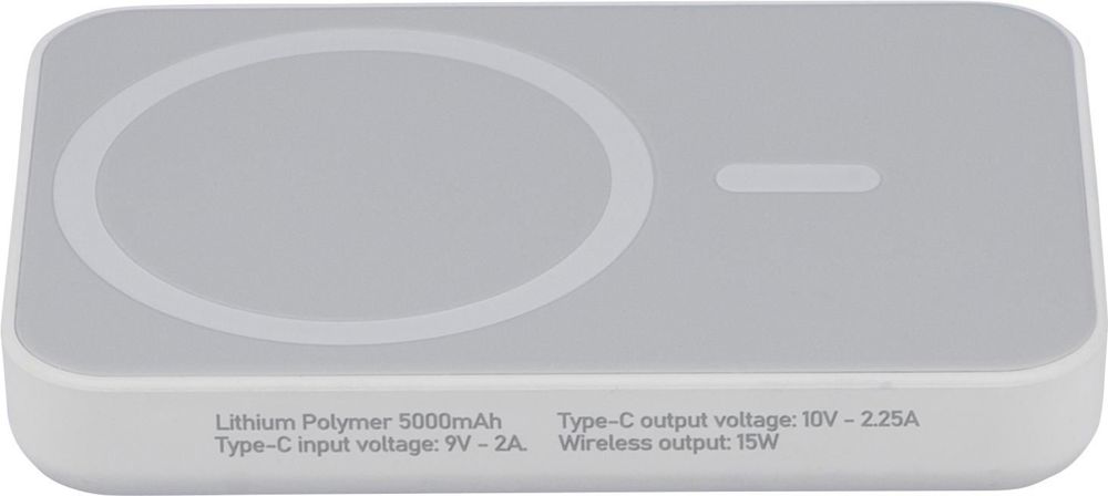 Gerecyclede ABS draadloze oplader-powerbank met 5.000?mAh Li-ion batterij en 15W magnetische draadloze oplaadoutput (compatibel met MagSafe). Type-C ingang tot 20W en Type-C uitgang: DC5V/3A, DC9V/2,22A, DC12V/1,67A. Voorzien van bescherming tegen oververhitting, kortsluiting, overspanning en overstroom. Stopt automatisch bij oververhitting. Inclusief extra metalen ring met zelfklevende achterkant voor draadloos opladen van niet-MagSafe apparaten. Voorzien van label met gerecycleerd ABS (RABS)-logo aan de zijkant. Individueel verpakt in een bruine kartonnen doos met zijdepapier.