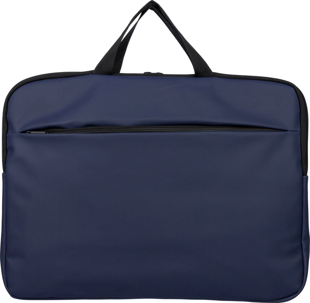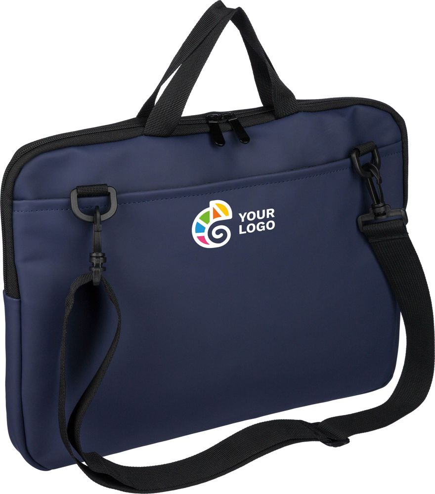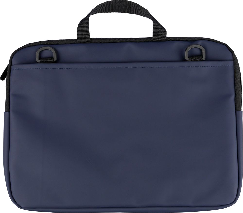 Laptoptas van gerecycled PU, geschikt voor laptops tot 15 inch, met 4 mm vulling en een voering van 210D gerecycled polyester. Voorzien van een voorvak met ritssluiting, een achtervak met klittenbandsluiting, twee korte draaghengsels en een verstelbare schouderriem. Inclusief een klein gerecycled logo in het binnenlabel.