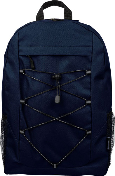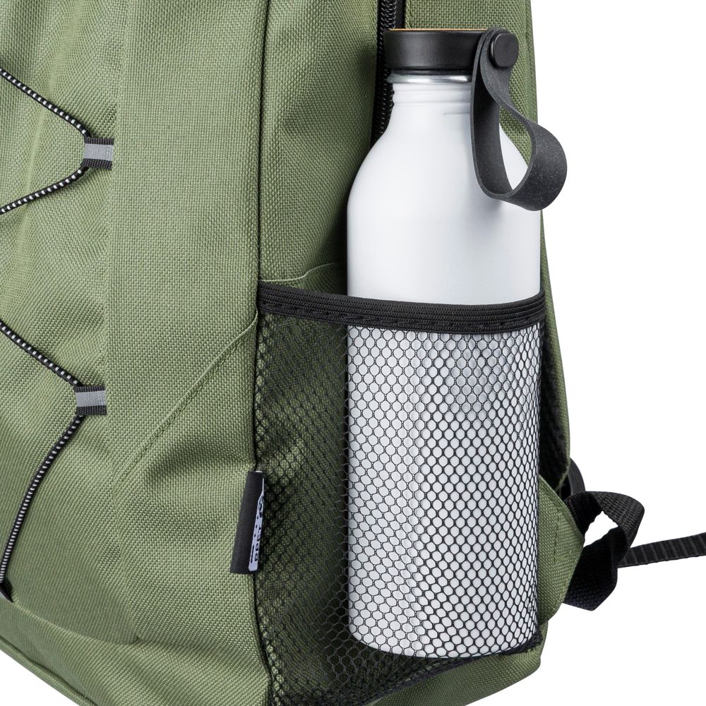 Avontuurlijke rugzak van 600D rPET-polyester met trekkoordsluiting en groot hoofdvak met ritssluiting. Voorzien van mesh zijvakken, elastische banden aan de voorkant om een deken of fles vast te zetten, en een open voorvak met ritssluiting voor decoratie. Voorzien van verstelbare schouderbanden en een rPET-label.