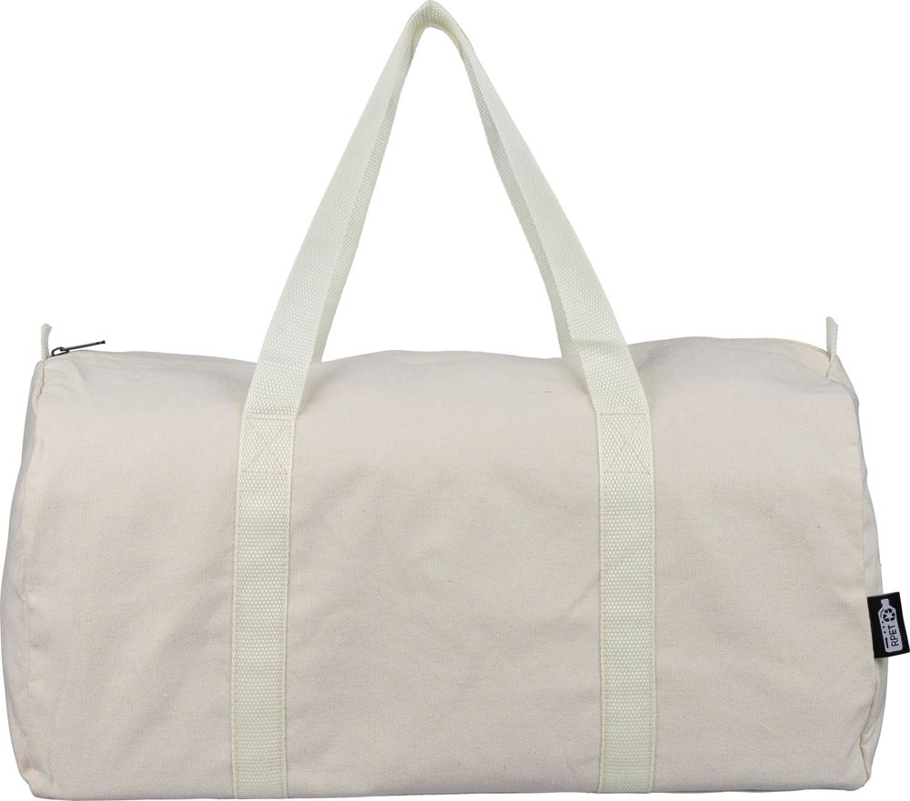 Duffle bag van gerecycled polykatoen (33?gsm) met een groot bovenvak met ritssluiting. Voorzien van lange draaghengsels (100?cm lang, 3?cm breed) en bijpassend bandmateriaal. Inhoud ca. 30 liter. Inclusief rPET-label aan de buitenzijde en een gerecycled label aan de binnenzijde.