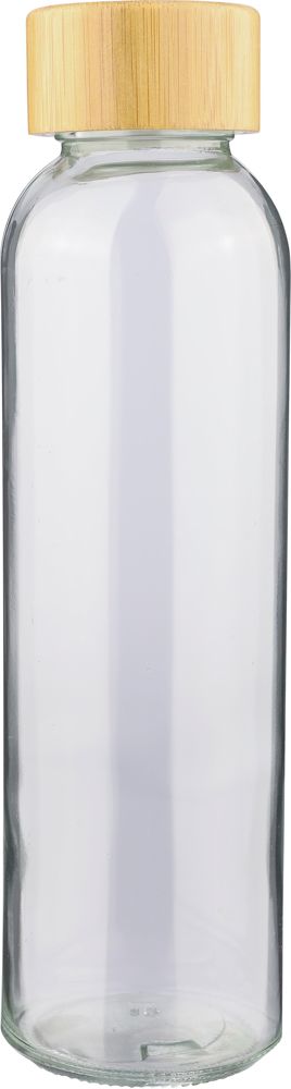 Glazen drinkfles (500?ml) met een matte buitenkant en een bamboe draaidop. Gemaakt van natriumcalciumglas en uitsluitend geschikt voor koude dranken. Individueel verpakt in een bruine kartonnen doos.