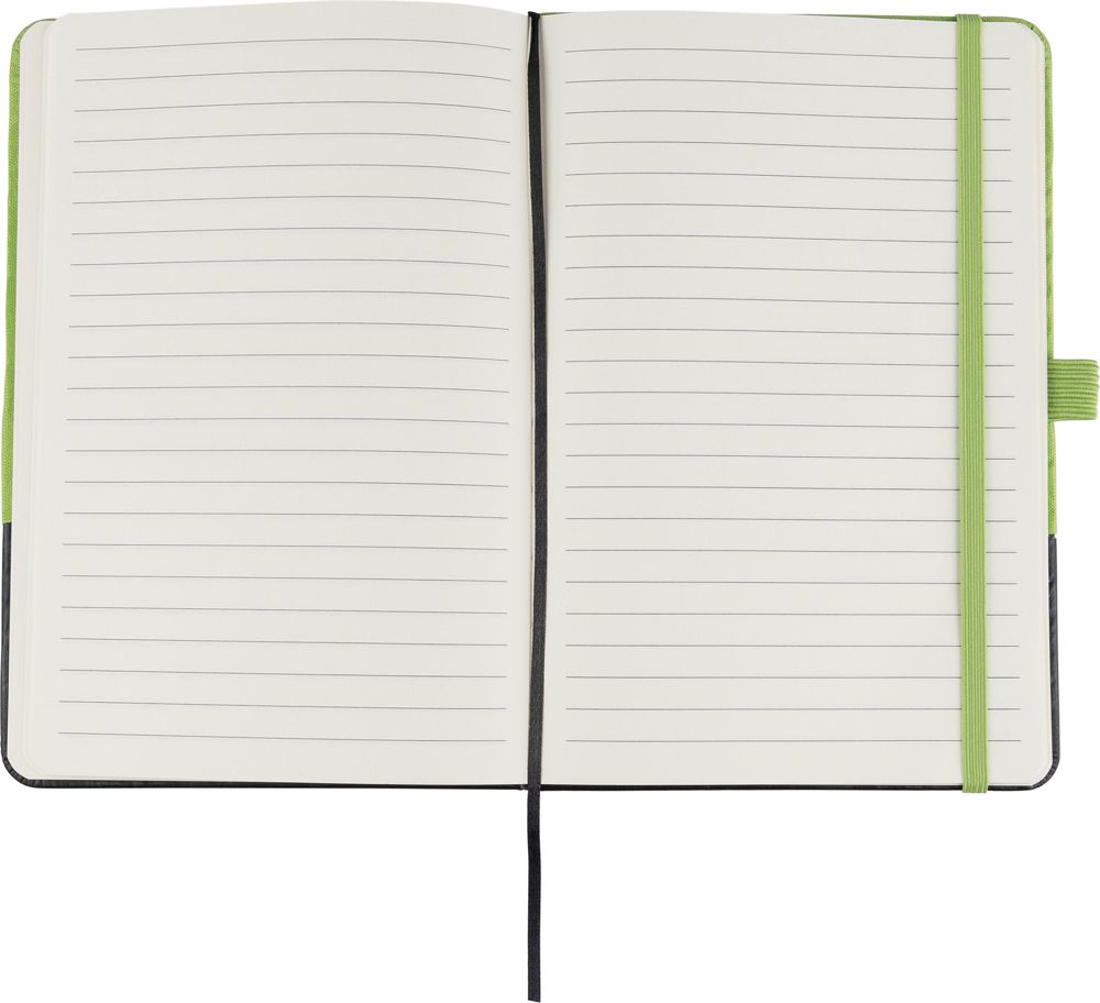 A5-notitieboek van rPET-polyester met deels laserbaar PU-voorvlak. Na graveren komt er een kleur tevoorschijn die overeenkomt met de rPET-stof. Voorzien van 80 gelinieerde pagina’s van 70?gsm, elastiek, pennenlus en bladwijzerlint. Het onderste PU-gedeelte is ontworpen om gegraveerd te worden en zo de bijpassende kleur zichtbaar te maken.