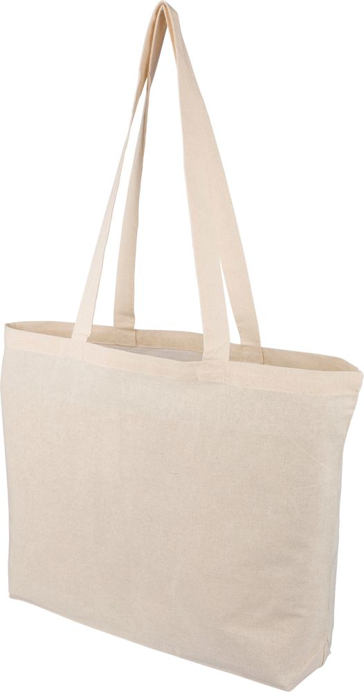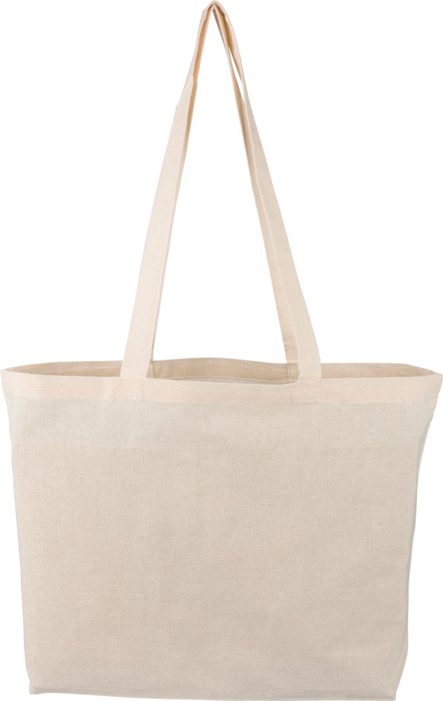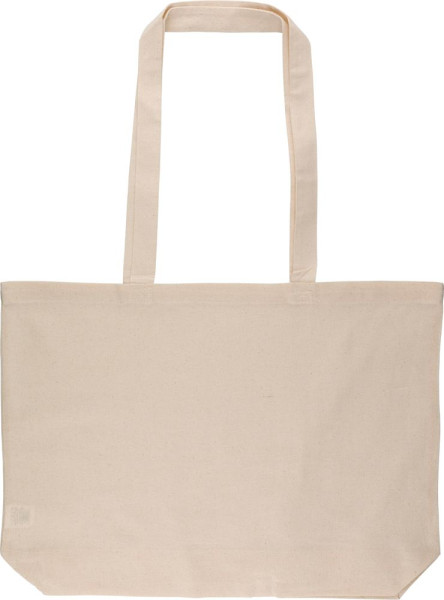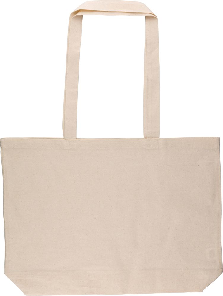 Katoen (14 g/m²) boodschappentas in natuurlijke kleur. Afmeting 48 × 34 × 10 cm met 70 cm lange hengsels (2,5 cm breed). Dit product is OEKO-TEX® STANDAARD 100 gecertificeerd.