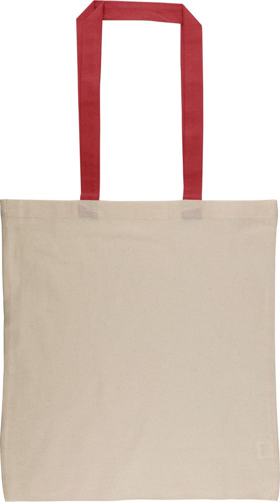 Katoen (14 g/m²) boodschappentas in natuurlijke kleur met gekleurde hengsels. Afmeting 38 × 42 cm met 70 cm lange hengsels (2,5 cm breed). Dit product is OEKO-TEX® STANDAARD 100 gecertificeerd.