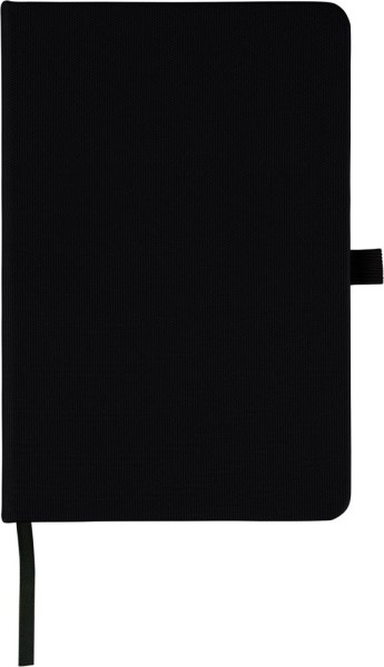 rPET 600D polyester notitieboek met PU-coating, papierformaat A5. Bevat 80 vellen gelinieerd papier van 70?gsm en is voorzien van een lintbladwijzer, elastische band en pennenlus. Semi-harde kaft. Inclusief een reliëflogo van gerecycled materiaal op de achterzijde.