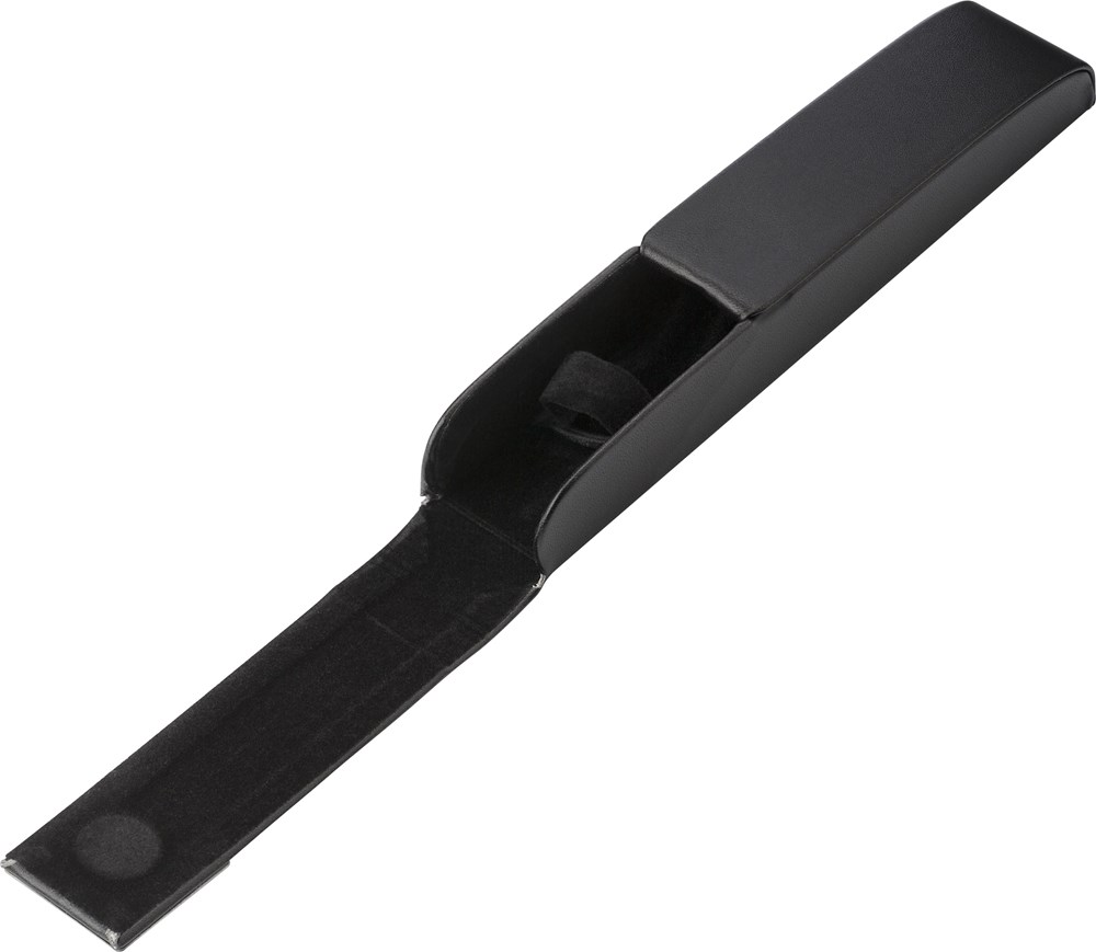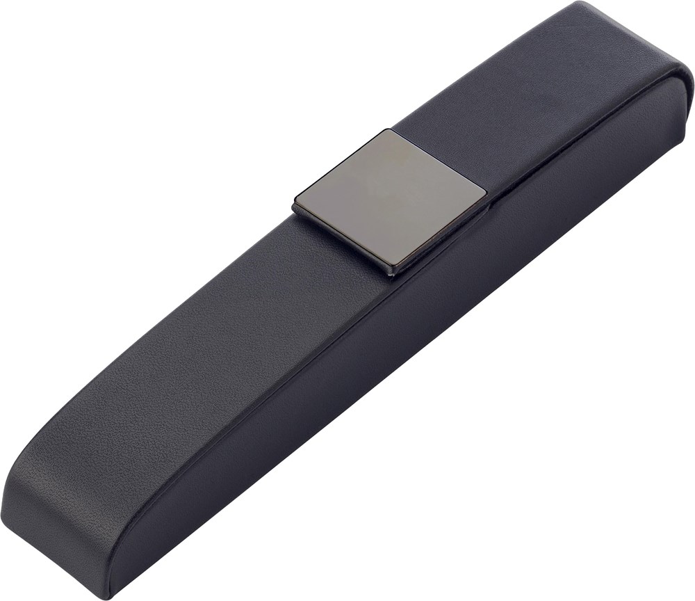Luxe zwarte PU pen cassette, geschikt voor één pen, met een zwart glanzende metalen plaatje voor...meer