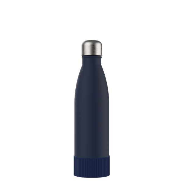 Voor warme of koude dranken, onze dubbelwandige roestvrijstalen fles met een trendy en functioneel design maakt indruk. Door de dubbele wand met vacuum blijven uw drankjes lang koud of warm. De drinkfles kan besteld worden met een edele matzwarte, met een witte poedercoating of natuurlijk met een zilverglans. De fles heeft een inhoud van 500 ml. Trek absoluut de aandacht met uw logo op de trendy drinkfles.