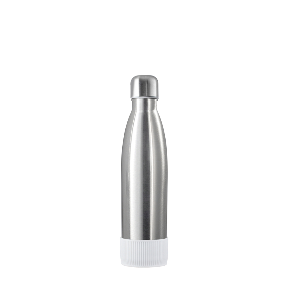 Voor warme of koude dranken, onze dubbelwandige roestvrijstalen fles met een trendy en functioneel design maakt indruk. Door de dubbele wand met vacuum blijven uw drankjes lang koud of warm. De drinkfles kan besteld worden met een edele matzwarte, met een witte poedercoating of natuurlijk met een zilverglans. De fles heeft een inhoud van 500 ml. Trek absoluut de aandacht met uw logo op de trendy drinkfles.