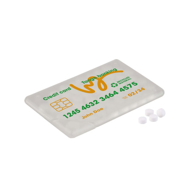 Transparante mint creditcard voorzien van 1 of 2 kleuren bedrukking op de bovenzijde, gevuld met ca. 8 gram suikervrije pepermuntjes