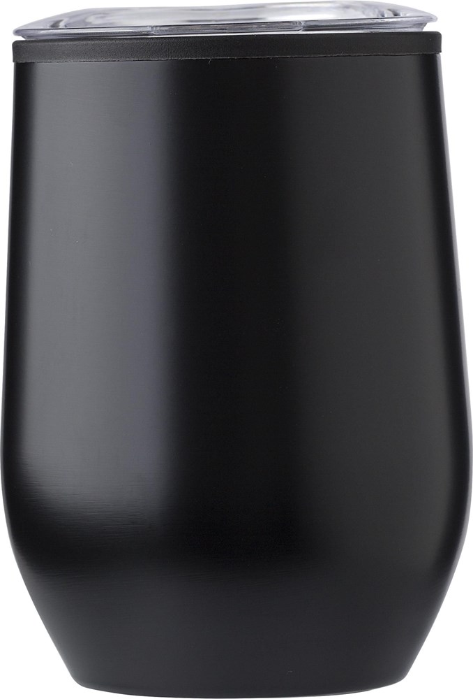 RVS reisbeker (300 ml) met PP binnenzijde en PS deksel. De mok heeft een afwerking. Individueel verpakt in een bruine kartonnen doos.