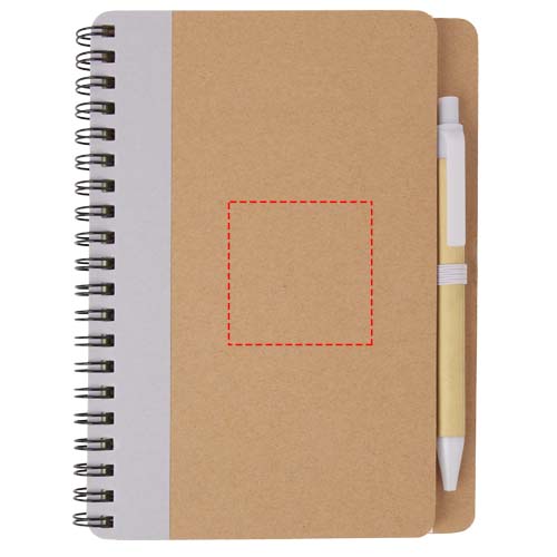 Notitieboek met omslag van gerecycled papier met 60 vellen gerecycled lijntjespapier en bijpassende pen. Notitieboek en pen samen verpakt.