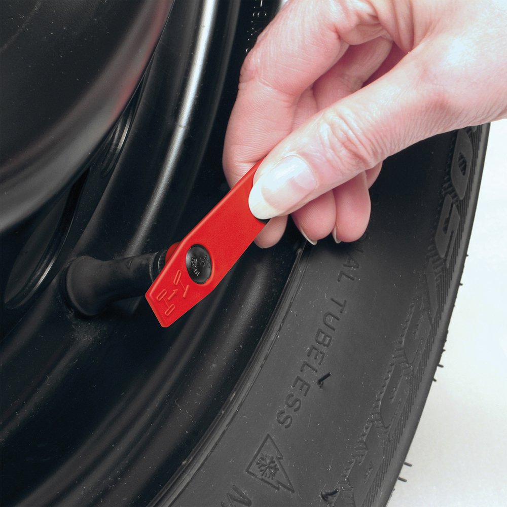 met bandenprofieldieptemeter en ventieldopschroevendraaier. UITLOPEND ARTIKELmeer