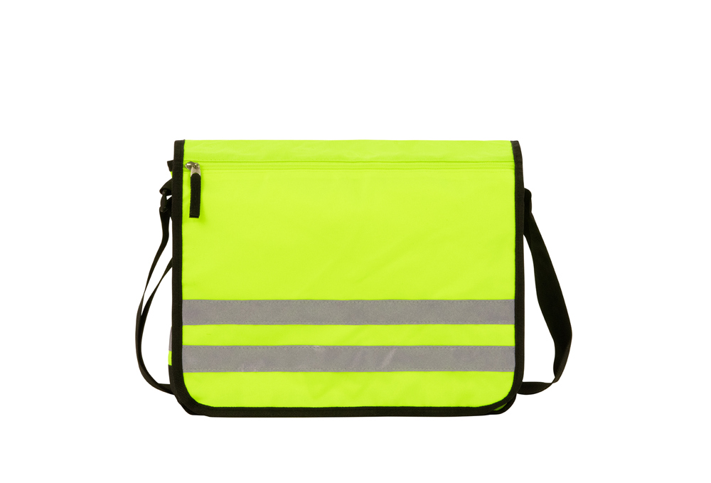 ruim hoofdvak, vlak insteekvak met organizerelementen; vak met rits in de overslag; in lengte verstelbare schouderriem met ingenaaid kussentje; oplichtend neongeel materiaal met 3M™ Scotchlite™ reflecterende strook