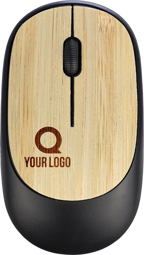 ABS draadloze muis met bamboedetails. Inclusief batterij. 2,4 GHz met USB-ontvanger en 1.200 DPI. Per stuk verpakt in een bruin kartonnen doos.