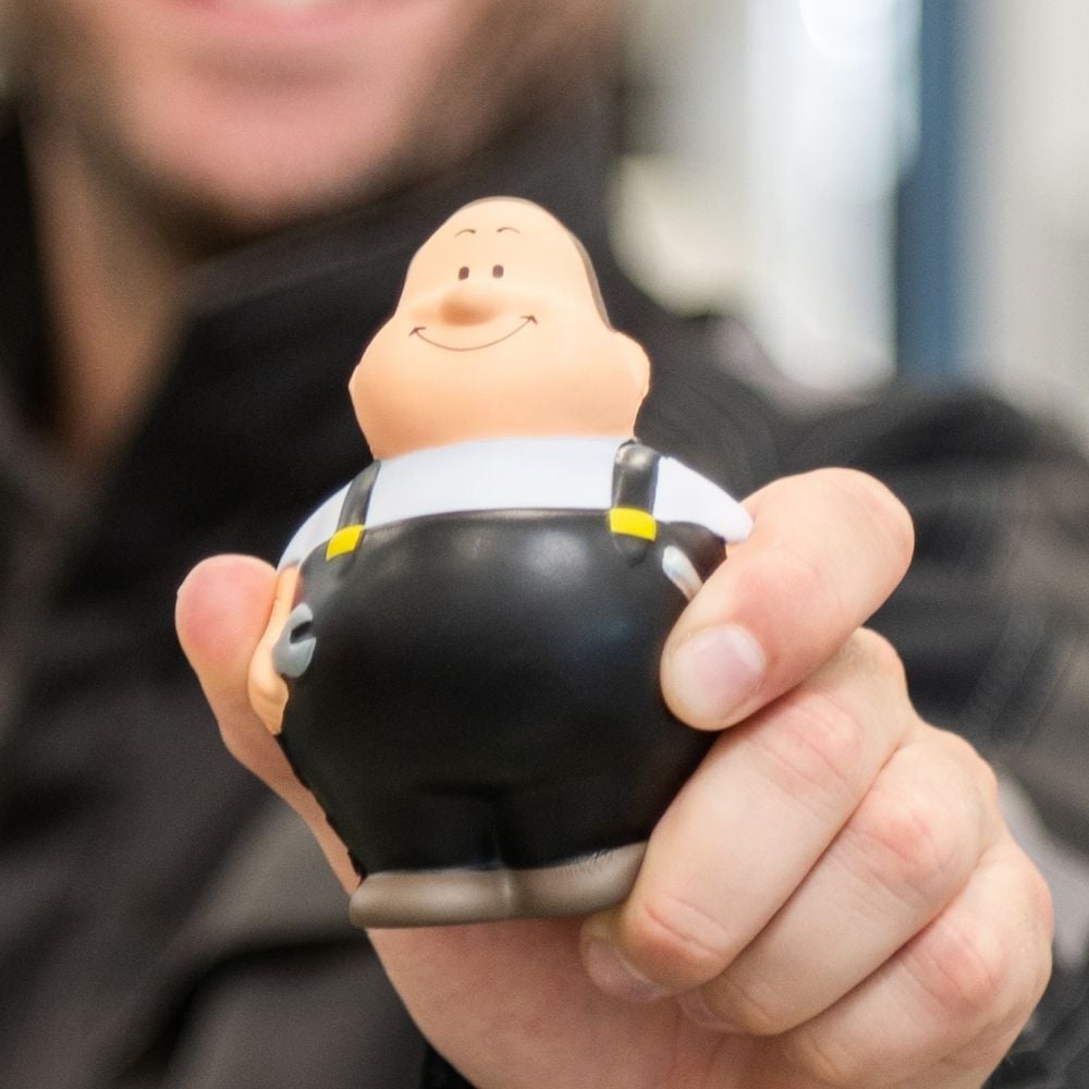 When things have to be broken and repaired, it's stressful and no fun. Then it's good to have worker Bert® with his screwdriver at hand. With him, every workshop visit is totally relaxed! Using a wrench and screwdriver, he ensures that everything works as it should - stress has no chance. Simply squeeze Worker Bert® with trousers to reduce stress. Due to the material's properties, the product returns to its original shape.